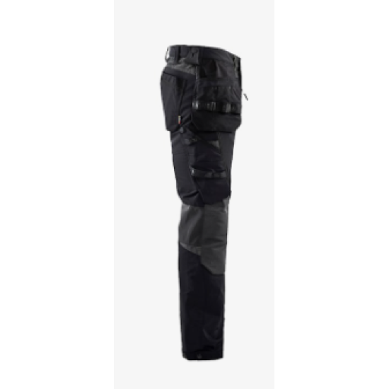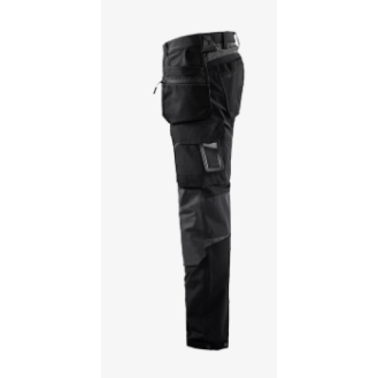 Featuring CORDURA®-stretch knee pad pockets with opening at the bottom, holster pockets one of which is zip-up, bellowed back pockets one of which is zip-up, a ruler pocket and a hammer holder loop on both sides.
